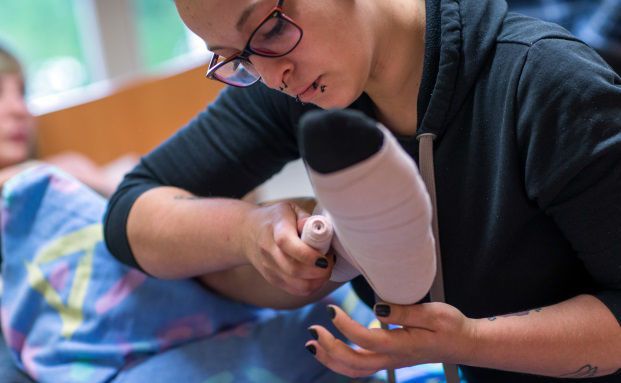 Eine Pflegeschülerin legt in der Altenpflegeschule der Diakonie in Schwerin bei einer Mitschülerin einen Thrombose-Verband an: Junge Leute sollten möglichst früh mit der Berufsausbildung beginnen..