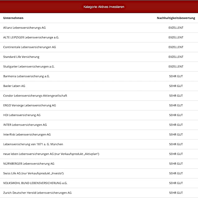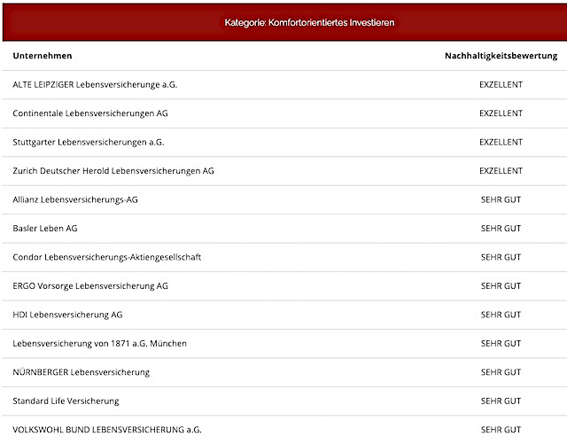Untersuchungsgegenstand war zum einen die grundsätzliche Positionierung des Anbieters zum Thema Nachhaltigkeit. Zum anderen schauten sich die Analysten das Fondsangebot im Hinblick auf Umfang und Qualität an. Auch Transparenz und Service gingen in die Bewertung ein. Tarife, die gegenüber der Benchmark weit überdurchschnittlich abschnitten, bekamen die Auszeichnung „Exzellent“; diejenigen die sich überdurchschnittlich stark zeigten, erhielten die Note „Sehr Gut“.
