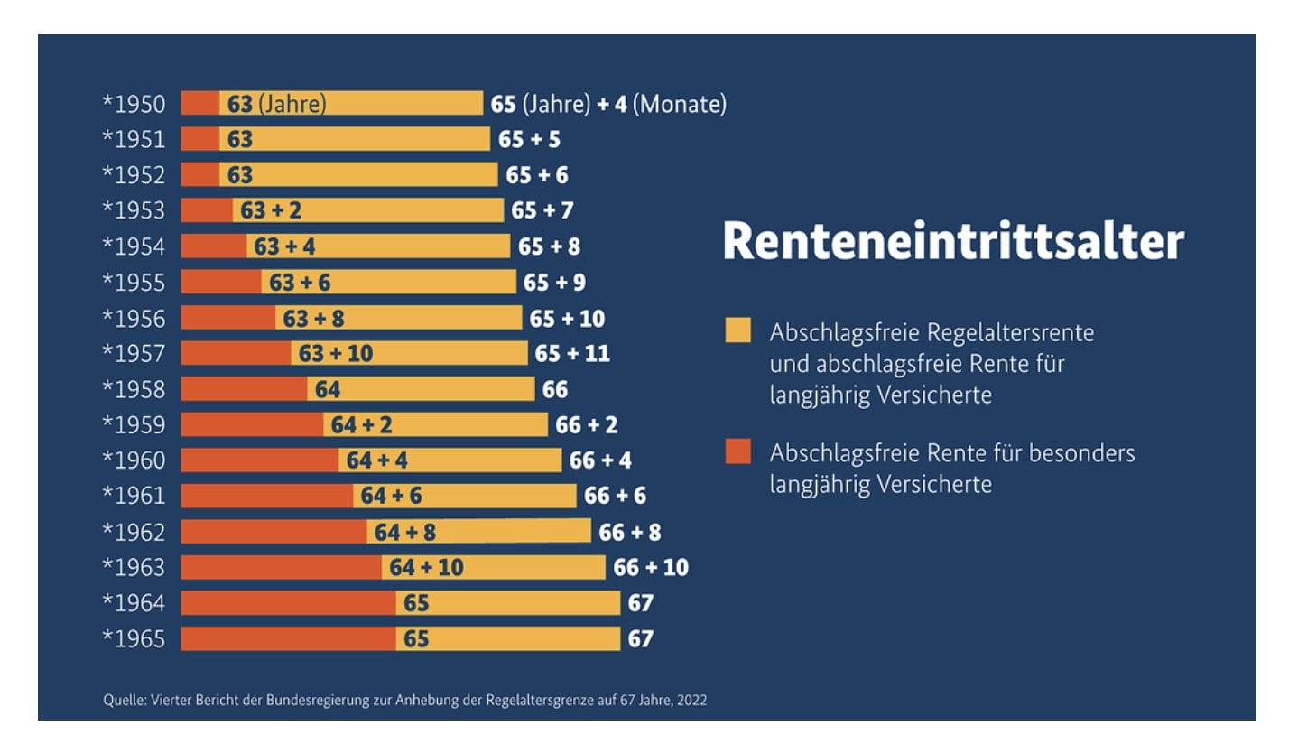 Das gesetzliche Rentensystem in Deutschland wurde in den vergangenen Jahrzehnten aufgrund des demografischen Drucks mehrfach angepasst. Auch das Renteneintrittsalter hat sich geändert. Die Anhebung begann im Jahr 2016 mit einem Anstieg von 65 Jahren um zwei Monate und betraf den Geburtsjahrgang 1953. Für jeden nachfolgenden Geburtsjahrgang verschiebt sich die Altersgrenze um zwei weitere Monate nach hinten. Für ab 1964 Geborenen gilt eine Regelaltersgrenze von 67 Jahren. Derzeit sind folgende Bestimmungen in Kraft.