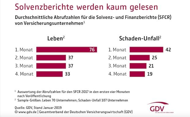 Der Branchenverband GDV ist bislang nicht zufrieden mit der Transparenz der Solvenzberichte (SFCR) nach Solvency II. Er bemängelt vor allem die Verständlichkeit. Die Berichte sollten „adressatgerechter“ gestaltet werden – mit einem verständlichen Bericht für Versicherungsnehmer sowie einem ergänzenden Datenteil für die Fachöffentlichkeit.