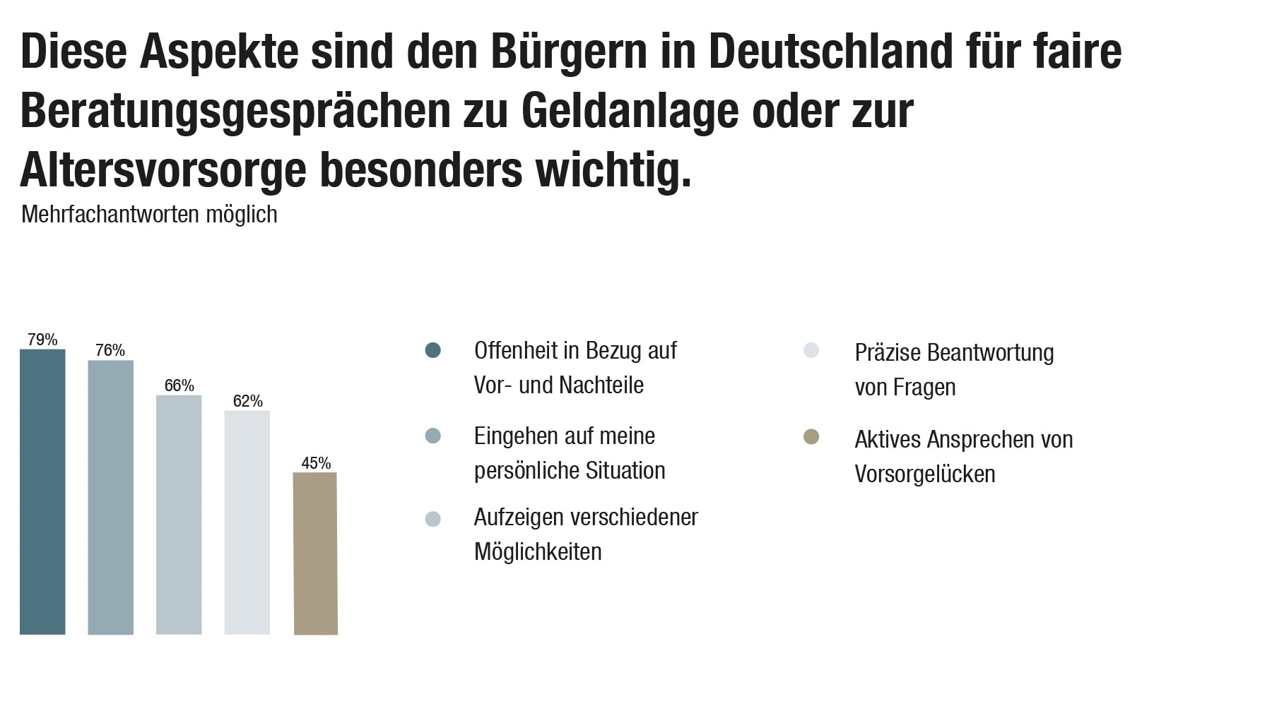 Und wie sieht eine faire Beratungssituation aus? Sie sollte für 79 Prozent der Befragten offen in Bezug auf Vor- und Nachteile sein. 76 Prozent wünschen sich, dass die Beraterin oder der Berater auf die jeweilige persönliche Situation eingeht.