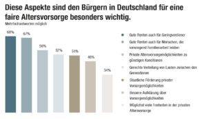 Außerdem fällt auf, dass gerade bei den Jüngeren der Wunsch nach einer guten Aufklärung über Vorsorgemöglichkeiten besonders stark ausgeprägt ist: Während der Bundesdurchschnitt bei 46 Prozent liegt, halten 57 Prozent der 18- bis 29-Jährigen diesen Aspekt für einen wichtigen Baustein, um eine faire Altersvorsorge zu gestalten.