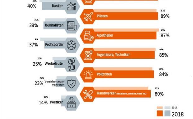 Deutlich hinzugewonnen hat der Erhebung zufolge keine Berufsgruppe, allerdings gibt es einige Rückgänge. Rechtsanwälte etwa, Profisportler und Profifußballer verloren jeweils etwa 5 Prozentpunkte. Auch Banker, mit 3 Prozentpunkten weniger und damit einem Rückgang von 43 auf 40 Prozent, sowie Pfarrer (minus 4 Prozentpunkte) büßten Vertrauen ein.