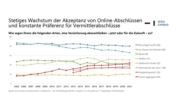 Der großen Mehrheit der Versicherungskunden in Deutschland (80 Prozent) sagt auch weiterhin der Abschluss einer Versicherung im Büro oder der Agentur eines Vermittlers zu – dieser Wert sei seit 2005 nahezu konstant geblieben, wie das Marktforschungsunternehmen Sirius Campus auf Basis der Marktuntersuchung „Kundenmonitor e-Assekuranz 2021 – Der Vertriebswege-Monitor“ mitteilte.