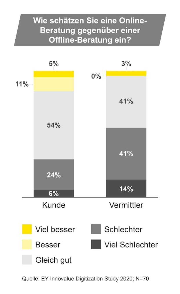 Dass Vermittlern nach wie vor viel daran gelegen ist, ihre Kunden auch weiterhin im direkten persönlichen Austausch zu beraten, zeigt der Vergleich zwischen Kunden und Vermittlern hinsichtlich ihrer Einstellung zur Online- beziehungsweise Offline-Beratung. So ergab die Umfrage, dass Kunden eine Online-Beratung signifikant positiver einschätzen als die Vermittler (siehe Grafik). In Zahlen ausgedrückt: 54 Prozent der Kunden empfinden eine Online-Beratung als gleich gut im Vergleich zur Offline-Variante, 16 Prozent finden „online“ sogar besser bis viel besser. „Die Vermittler sind dahingegen deutlich zurückhaltender“, heißt es bei EY Innovalue. Über die Hälfte (55 Prozent) schätzt die Beratung demnach als schlechter ein, 41 Prozent als gleichwertig und nur 3 Prozent halten den rein virtuellen Prozess für eine bessere Alternative.