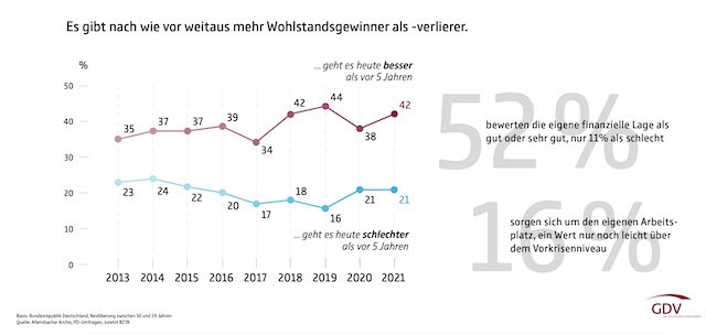Die Deutschen im Alter von 30 bis 59 Jahren, also die sogenannte Generation Mitte, schaut trotz Corona-Pandemie recht optimistisch in die Zukunft. 37 Prozent geben das an in einer Umfrage des Instituts für Demoskopie Allensbach im Auftrag des Branchenverbands GDV an.  ergab. Im vergangenen Jahr lag dieser Wert bei nur 22 Prozent.