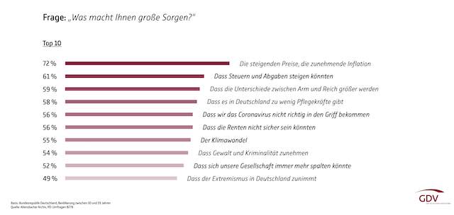 Sorgen machen sich zum Beispiel die Eltern aus der Generation Mitte darum, dass sich die eigenen Kinder mit dem Corona-Virus infizieren könnten. Auch das seit Anfang des Jahres stark steigende Preisniveau, insbesondere für Energie und Lebensmittel, und die Erwartung von steigenden Steuern oder Abgaben treiben die Bürgerinnen und Bürger um. Zwei Drittel von ihnen belasten die steigenden Preise stark.