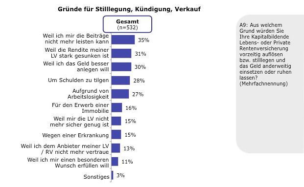Zu den Hauptgründen, warum sie eine Lebensversicherung stilllegen, kündigen oder verkaufen würden, gaben 35 Prozent finanzielle Probleme an, durch die sie sich die Beitragszahlungen nicht mehr leisten können. Für 31 Prozent ist die stark gesunkene Rendite der Lebensversicherungen ausschlaggebend und 30 Prozent würden ihr Geld gerne besser anlegen.
