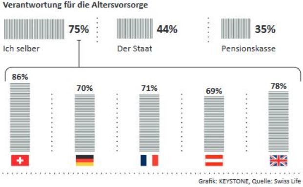 Bei der Frage, ob sie sie selbst verantwortlich für ihre Altersvorsorge seien, stimmten 70 Prozent der Deutschen zu. Zum Vergleich: Drei Viertel der Befragten aus allen fünf Ländern bejahten dies – wobei der Anteil in der Schweiz mit 86 Prozent am höchsten ist, dahinter folgt Großbritannien (78 Prozent). In Frankreich liegt der Anteil bei 71 Prozent, in Österreich ist er mit 69 Prozent ähnlich hoch wie in Deutschland.