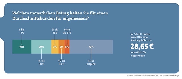 Im aktuellen AfW-Vermittlungsbarometer, für das der Verband mehr als 1.300 Vermittelnde befragt hat, spielt das Thema Vergütung eine wichtige Rolle. So gaben 60 Prozent der Befragten an, dass sie ihren Mehrwert als Berater klar beschreiben können und ihre Kunden wissen, welche Leistung sie erbringen und welchen Wert die Zusammenarbeit mit ihnen hat. „Die Ablehnung, die Vergütung von der Abschluss- zur Bestandsprovision hin zu verlagern, ist klar gesunken. Statt 40 Prozent wie im Vorjahr sind nur mehr 25 Prozent dagegen“, erläutert Wirth. Mit 43 Prozent steht eine relative Mehrheit der Frage positiv gegenüber. Auch zur Höhe einer Servicegebühr haben viele Befragte eine Vorstellung.