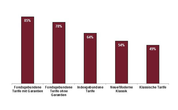 Zu fondsgebundenen Tarifen wird am häufigsten beraten, wobei Garantien innerhalb dieser Produktgattung immer noch eine wesentliche Rolle spielen.