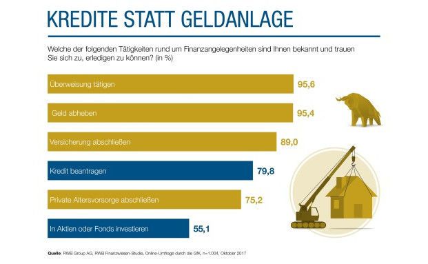 Eine deutlich höhere Risikobereitschaft legen die Bundesbürger an den Tag, wenn es um Schulden geht. Knapp 80 Prozent der Befragten wären dazu bereit, einen Kredit aufzunehmen. Zum Vergleich: 89 Prozent trauen sich zu, eine Versicherung abzuschließen oder zu wechseln. 75 Prozent bestätigen dies, wenn es generell um das Thema private Altersvorsorge geht. Einfache Angelegenheiten am Geldautomaten oder Überweisungen traut sich fast jeder zu.