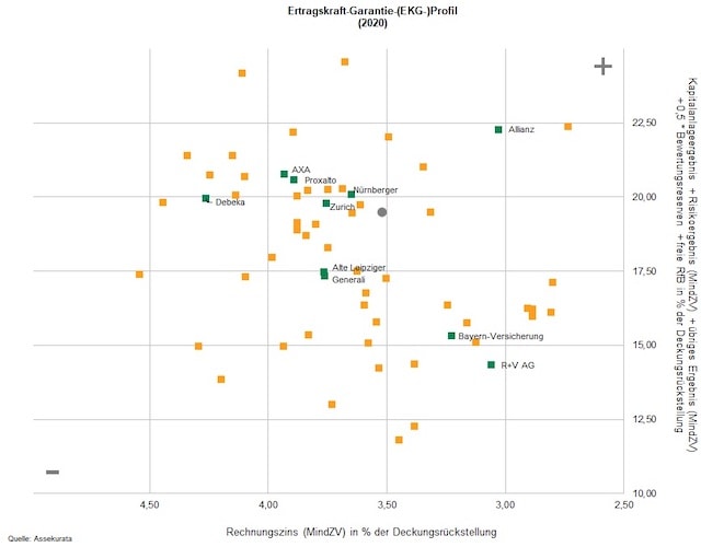 Um den Zusammenhang zwischen Ertragskraft und Garantie zu verdeutlichen, hat Assekurata in der Studie das Ertragskraft-Garantie-Profil (EKG-Profil) ermittelt. Die garantiebedingten Rechnungszinsanforderungen wurden hierbei der vorhandenen Ertragskraft gegenübergestellt, wobei neben der Kapitalanlage auch weitere Ergebnisquellen und die anteiligen Bewertungsreserven berücksichtigt wurden.