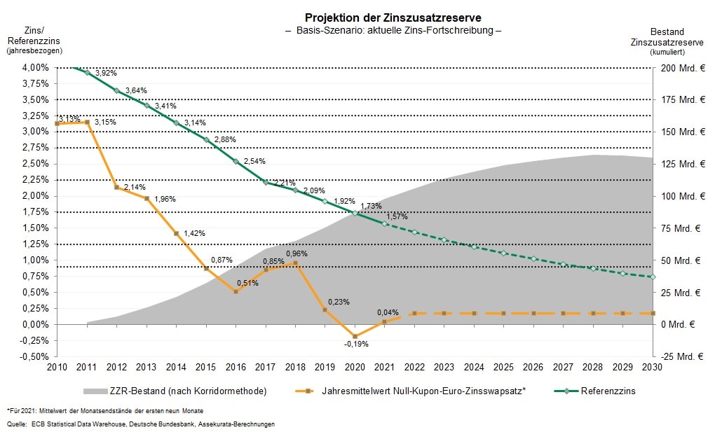 Seit 2011 müssen die Lebensversicherer für Letzteres die Zinszusatzreserve (ZZR) bilden, die bis Ende 2020 marktweit auf rund 86 Milliarden Euro angewachsen ist. Trotz einer leichten Zinserholung ist der für die ZZR-Berechnung geltende Referenzzins 2021 weiter gefallen, was aus Sicht der Studienautoren in diesem Jahr zu einem neuerlichen Zuführungsbedarf von 11 Millionen Euro führen wird.