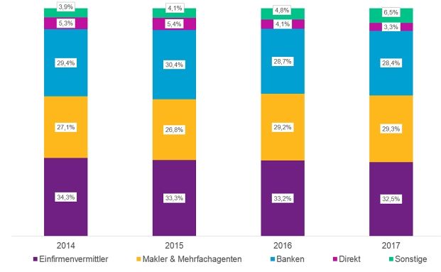 Einfirmenvermittler verkaufen nach wie vor die meisten Lebensversicherungen hierzulande. Ihr Anteil am Neugeschäft 2017 betrug 32,5 Prozent. Die Gruppe der Makler und Mehrfachagenten verharrte auf dem Vorjahresniveau von knapp 29 Prozent Neugeschäftsanteil. Das zeigt die 19. Vertriebswege-Studie 2017 für die Lebensversicherung von Willis Towers Watson.