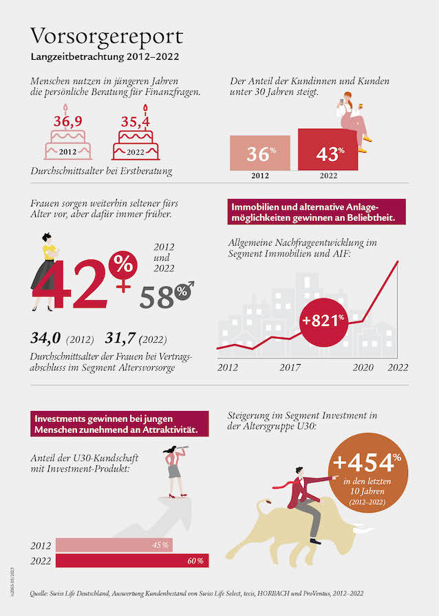 Die gegenwärtige Inflation führt aktuell nicht zu einer nachhaltigen Veränderung im Vorsorgeverhalten. „Die Menschen bleiben ihrer Altersvorsorge auch in Inflationszeiten treu“, so Swiss-Life-Chef Arnold. Kundinnen und Kunden hätten zunächst die Entwicklungen beobachtet und investierten gegenwärtig wieder verstärkt in ihre Alterssicherung mit einem Plus von mehr als 20 Prozent in den ersten drei Monaten 2023. Die Nachfrage nach der staatlich geförderten Riester-Rente erreichte dabei im vergangenen Jahr einen Tiefstand. Nachfragewachstum gab es vor allem in den Bereichen Immobilien und Bausparen.