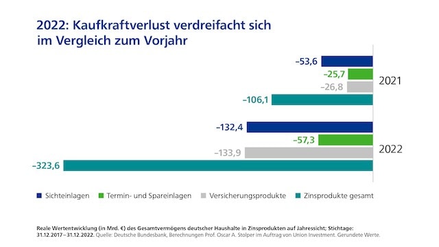 Damit erhöhte sich der Bestand beim Bargeld auf 430 Milliarden Euro, bei den Sichteinlagen auf 1.857 Milliarden und bei den Sichteinlagen auf 873 Milliarden Euro. Die Realverzinsung von Sichteinlagen sowie Termin- und Spareinlagen lag im Jahresmittel wertgewichtet bei minus 7,12 Prozent. Der kollektive Kaufkraftverlust aus Zinsprodukten (einschließlich kapitalbildender Versicherungsprodukte) habe sich daher im Vergleich zu 2021 auf 324 Milliarden Euro verdreifacht.