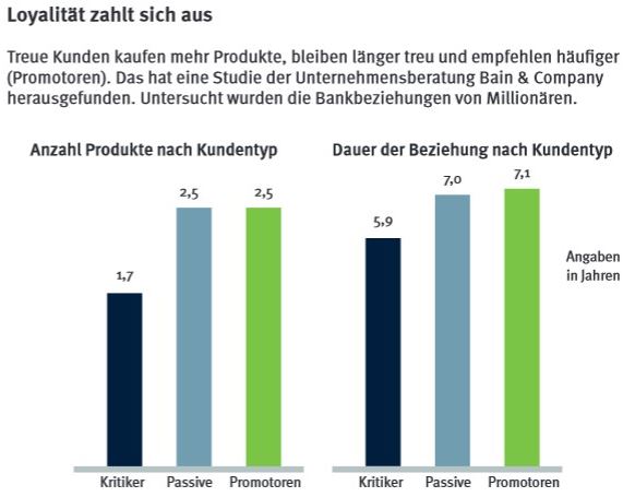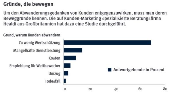 Beispiele dafür sind das Fehlen einer allgemeinen Wertschätzung in Verhandlungen oder der Mangel an Qualität in der Beratung. Die Preise oder Konditionen, welche vor allem die Mitarbeiter einer Bank beschäftigen, sind indes nicht die entscheidenden Beweggründe, weshalb ein Kunde abspringt.