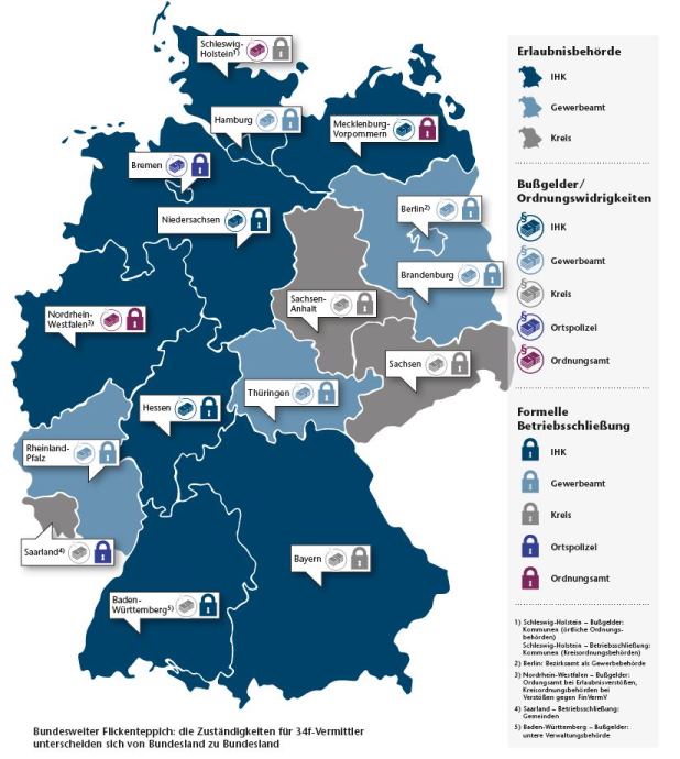 Entsprechend holprig verlief die erste Runde. „Zum Stichtag hatten rund 15 bis 20 Prozent der dazu verpflichteten Vermittler keinen Prüfbericht eingereicht“, sagt Mona Moraht, Leiterin Gewerberecht des DIHK. Bisweilen hatten die Wirtschaftsprüfer und Steuerberater Terminprobleme und um Karenzzeit gebeten. Im ersten Quartal wurde dann angemahnt. „Laut aktuellem Stand im Juli fehlen nur mehr 2 Prozent“, so Moraht. Die Androhung von Zwangsgeld und ordnungsrechtlichen Maßnahmen wie Bußgelder werden geprüft. Allerdings ist ein Branchenüberblick schwierig angesichts des Flickenteppichs an Zuständigkeiten für die 34f-Vermittler. Die IHKs sind nur in 9 der 16 Bundesländer für die Prüfung und in nur 3 Ländern für die Bußgelder zuständig.