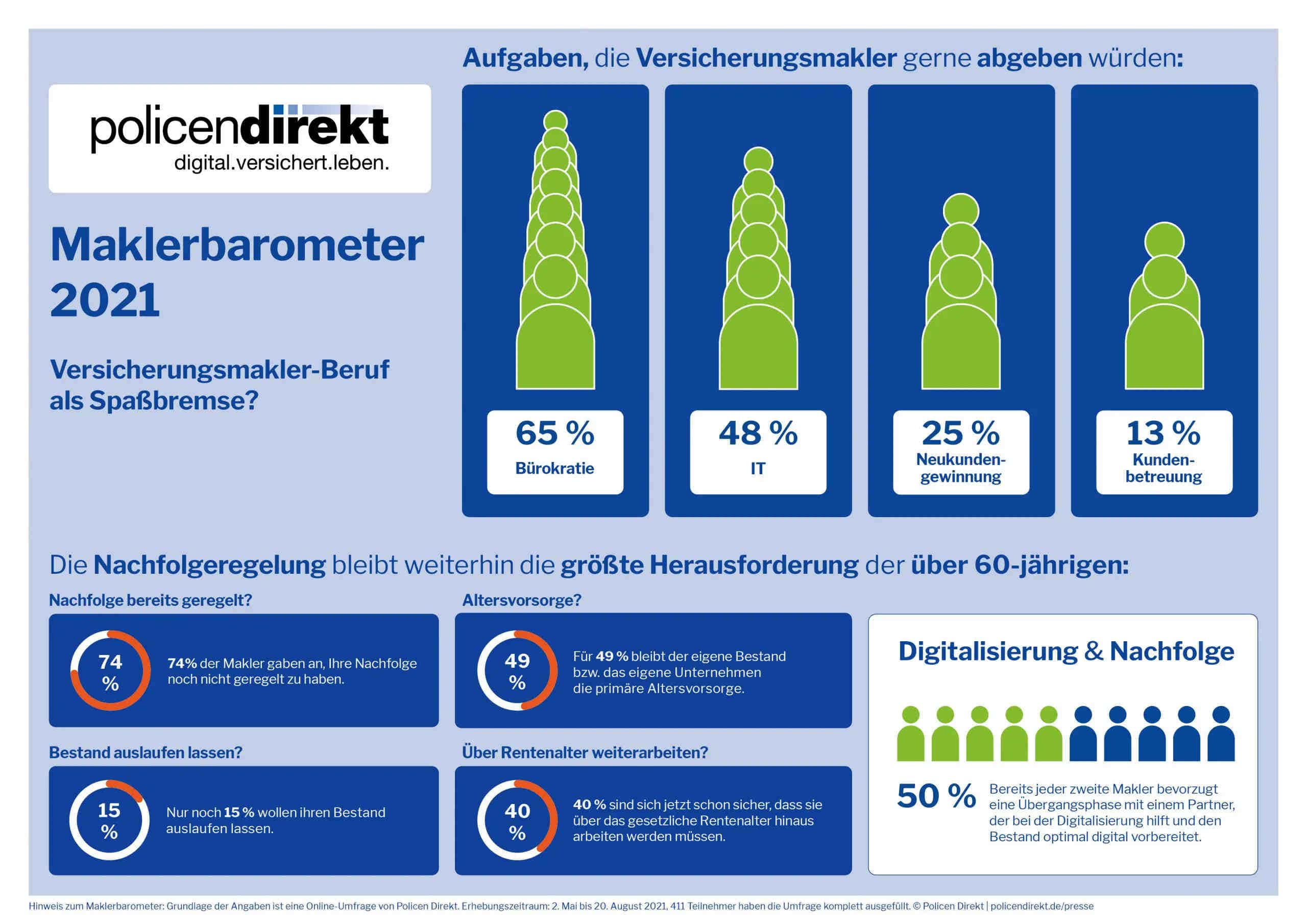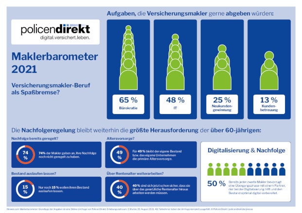Deutschlands Versicherungsmakler verbringen inzwischen mehr als die Hälfte ihrer Arbeitszeit mit bürokratischen und technischen Tätigkeiten, obwohl sie diese Arbeiten gern abgeben und sich mehr um ihre Kunden kümmern würden. Das ist das zentrale Ergebnis des Maklerbarometers 2021 des Zweitmarkthändlers Policen Direkt, für den über 400 Makler befragt wurden.
