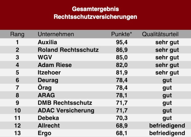 Der Gesamtsieg geht an Auxilia. Der Anbieter überzeugt laut DISQ mit seinem Basis- und Premium-Tarif aus Privat-, Berufs- und Verkehrsrechtsschutz mit hervorragenden Leistungen. Den zweiten Rang belegt Roland Rechtsschutz, ebenfalls mit einem sehr guten Gesamtergebnis. Auf Platz drei positioniert sich WGV, dahinter reihen sich Adam Riese und Itzehoer ein.