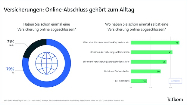 Acht von zehn Deutschen (79 Prozent) haben schon einmal eine Versicherung online abgeschlossen, teilte der Digitalverband Bitkom kürzlich auf Basis einer repräsentativen Umfrage mit (siehe Grafik). Unter den 16- bis 29-Jährigen und den 30- bis 49-Jährigen liegt dieser Anteil mit je 94 Prozent sogar noch deutlich darüber.