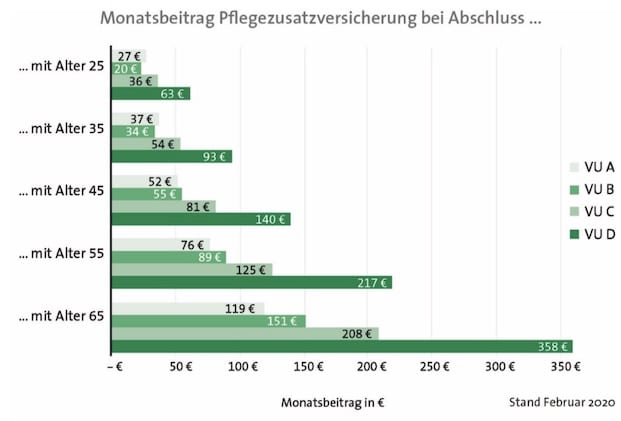 Dazu merken die Autoren an, dass sich aufgrund der Leistungsunterschiede in den Pflegegraden – speziell bei ambulanter Pflege – sich auch die Tarifbeiträge unterscheiden. Versicherer B bietet demnach einen vergleichsweise günstigen Tarif. Das Angebot des Versicherers C liege im mittleren Preissegment und der Tarif von Versicherer D bewege sich preislich im oberen Bereich.