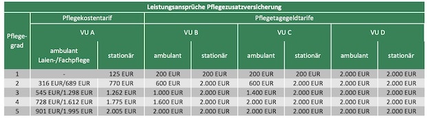 Konkret wurden die Beiträge für unterschiedliche Eintrittsalter erhoben – jeweils für eine Pflegekostenversicherung sowie drei Pflegetagegeldtarife. Um die durchschnittlich bestehende Pflegelücke zu decken, wurde hierbei beim Pflegekostentarif die Verdoppelung der gesetzlichen Leistung (Aufstockung um 100 Prozent) und bei den Pflegetagegeldtarifen eine Leistung von monatlich 2.000 Euro bei stationärer Pflege in den Pflegegraden 2 bis 5 vorausgesetzt (siehe Tabelle).