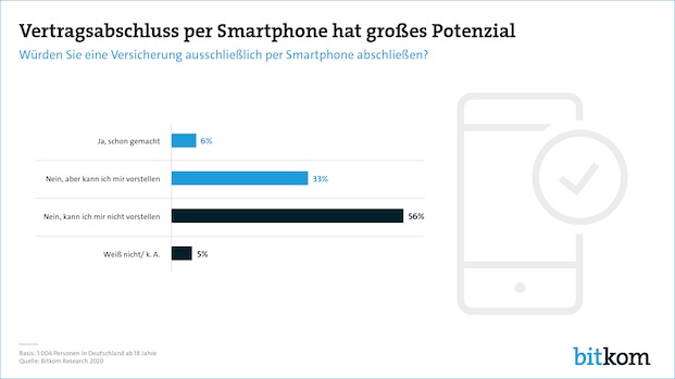 Unter den Bundesbürgern haben bislang 6 Prozent eine Versicherung mit dem Smartphone abgeschlossen (siehe Grafik). Unter den 18- bis 29-jährigen haben das bereits 8 Prozent getan, 37 Prozent in dieser Altersgruppe können sich vorstellen das zu tun. Bei den 30- bis 49-Jährigen sagen das sogar 46 Prozent, 5 Prozent haben damit bereits praktische Erfahrungen. Das ergab eine Umfrage im Auftrag des Digitalverbands Bitkom unter 1.004 Personen in Deutschland ab 18 Jahren.