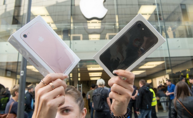 Hurra, es ist ein iPhone: Die Besitzerin von zwei neuen iPhone7 posiert am 16. September 2016 in München zum Verkaufsstart des neuen Smartphones. Auch wenn diese Technik begeistern, heißt das noch lange nicht, dass der Online-Abschluss einer Versicherung mit dem gleichen Elan über die Bühne geht.