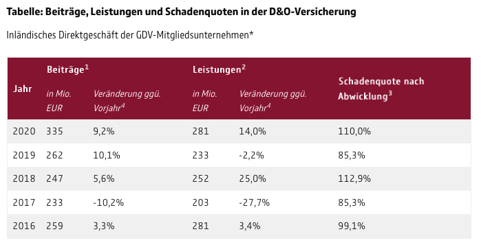 „Während die Beiträge um gut 9 Prozent auf 335 Millionen Euro stiegen, wuchsen die Leistungen um 14 Prozent. Unter dem Strich stehen erhebliche Verluste, die sich aus den immer größeren Haftungsrisiken für Managerinnen und Manager ergeben“, so Asmussen weiter. Die Schadenquote nach Abwicklung habe 110 Prozent betragen. Somit hätten die Bruttoaufwendungen für Versicherungsfälle nach Abwicklung deutlich über den verdienten Bruttobeiträgen gelegen.