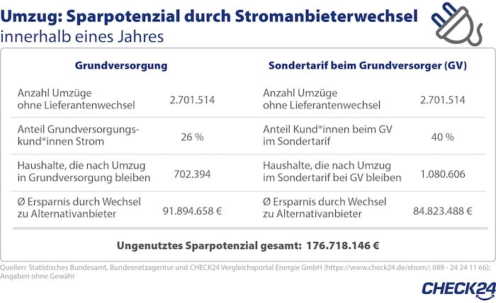 Denn: Nach einem Umzug landet man meist beim Grundversorger der Region; und der ist meistens deutlich teurer als alternative Anbieter. Laut Check24 sind aktuell rund 26 Prozent der Stromkunden in der Grundversorgung, weitere 40 Prozent haben einen Sondertarif beim Grundversorger. Das heißt also: Von den rund 2,7 Millionen Haushalten, die nicht wechseln, zahlen knapp 1,8 Millionen Haushalte zu viel für ihren Strom – und verschenken damit innerhalb eines Jahres etwa 177 Millionen Euro, wie Zahlen des Statistischen Bundesamts und der Bundesnetzagentur zeigen, die Check24 vorliegen.