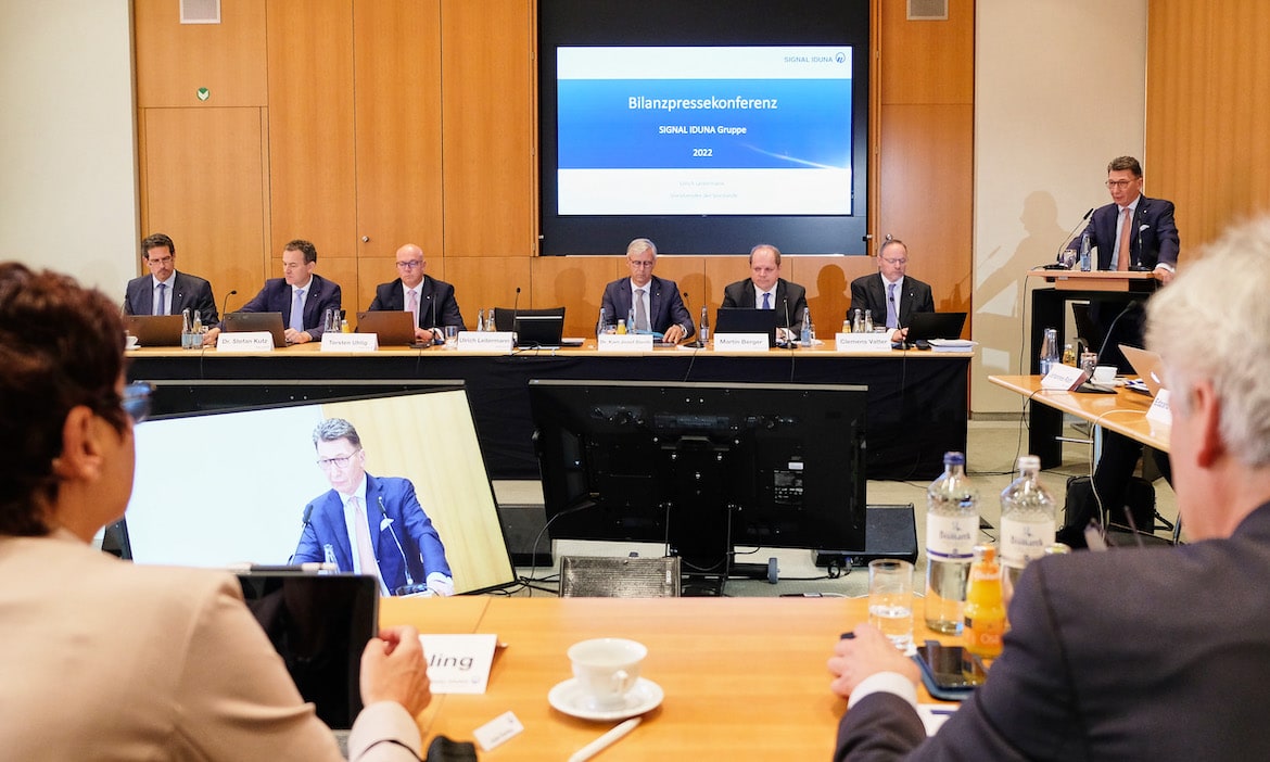 Der Versicherer Signal Iduna kann für das Geschäftsjahr 2021 ordentliche Zahlen vermelden: Um 3,4 Prozent auf 6,3 Milliarden Euro legten die Bruttobeitragseinnahmen bei der Versicherungsgruppe mit Sitz in Dortmund und Hamburg zu – man sei damit mehr als doppelt so schnell gewachsen wie der deutsche Versicherungsmarkt, berichtete Konzernchef Ulrich Leitermann (im Foto am Rednerpult) am Mittwoch im Rahmen der Bilanzpressekonferenz in Hamburg.