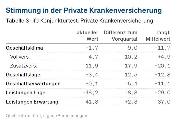 Darin fällt aber auch auf, wie pessimistisch sich die PKV-Anbieter zeigen, wenn es um die Ausgabenseite geht. Ein Index von minus 48,2 Punkten zur Lage und minus 41,8 Punkten zur Erwartung sind schon ein Wort. Offenbar befürchten die Anbieter, dass sie künftig mehr und mehr zahlen müssen.