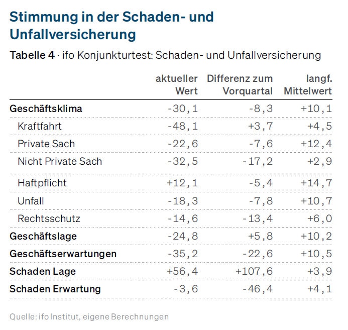 Auch dort liegen die Salden zum Teil deutlich unter den langfristigen Durchschnitten. Kräftige Ausreißer liefern die Kraftfahrtsparte mit minus 48,1 Punkten beim Geschäftsklima und die aktuelle Lage beim Schaden mit plus 56,4 Prozent. Auch insgesamt wirkt das Bild eher diffus, wie die Tabelle zeigt.