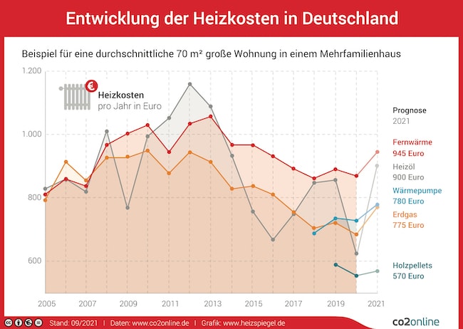 Hauptgrund für die unterschiedlichen Heizkosten seien Schwankungen bei den Energiepreisen. Vor allem der Preis für Heizöl sei erst gefallen und nun wieder kräftig gestiegen. Das wirke sich auf die Heizkosten mit Heizöl aus, schreibt CO2online: Nach minus 27 Prozent im Jahr 2020 wird der Preis in diesem Jahr voraussichtlich um 44 Prozent wachsen.
