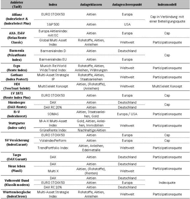 Drei Versicherer – die Condor, die VGH und die Generali – haben ihre Produkte vor diesem Hintergrund bereits vom Markt genommen. Andere Anbieter wie die R+V haben ihren Tarif überarbeitet und setzen nun auf einen neuen Index: der SOMAS Index (Solactive Multi Anlage Stabil Index) löst den Eurostoxx 50 ab – in Kombination mit einer Partizipationsquote (vormals Cap).