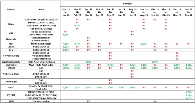 Insbesondere Anbieter, deren Indexmodell auf dem Cap-Verfahren, also einer Renditeobergrenze basiert, hätten ihren Kunden so keine Gutschriften aus der Indexpartizipation weitergeben können. Daran habe auch die sehr rasche Erholung des Aktienmarktes im Laufe des Jahres nichts mehr ändern können.