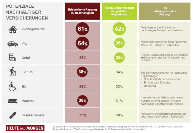 Versicherer haben insbesondere in der jüngeren Generation die langfristige Chance, mit nachhaltigen Produkten erfolgreich zu sein. Grundsätzlich können sich heute bereits rund 60 Prozent aller Verbraucher vorstellen, in Zukunft gezielt solche Produkte abzuschließen – Unter-30-Jährige und besonders bewusst lebende Menschen meinen dies sogar zu über 80 Prozent. Das zeigt eine aktuelle Nachhaltigkeitsstudie des Marktforschers Heute und Morgen, für die 1.500 Deutsche ab 18 Jahren repräsentativ befragt wurden.