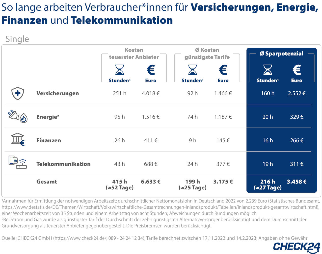 Die Wörtchen „bis zu“ deuten an, dass es sich um Maximalbeträge handelt, die Check24 ermittelt hat. Und die belaufen sich bei Familien auf insgesamt 12.192 Euro pro Jahr für Versicherung, Energie, Finanzen und Telefon/Internet. Macht die erwähnten 95 Tage Arbeit, also gut drei Monate.