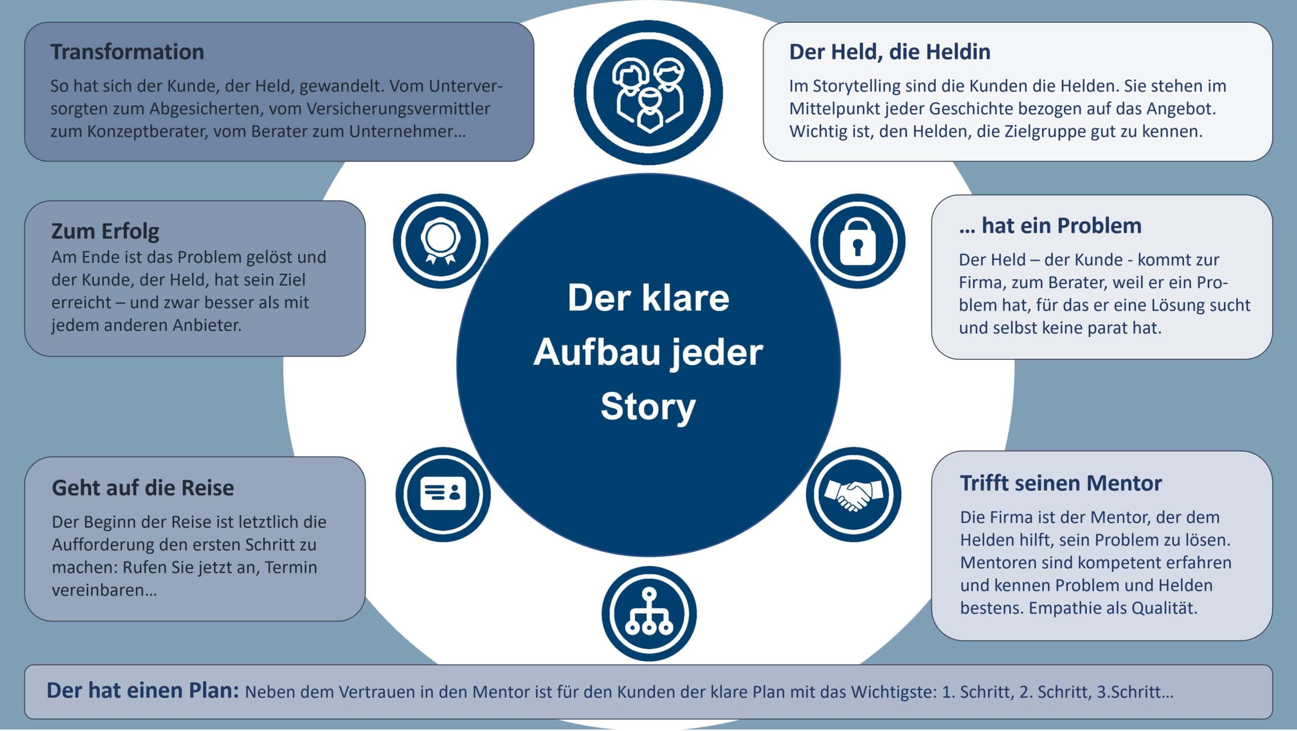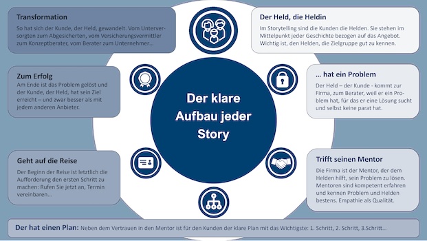 Da Storyteller den Kunden zum Helden der Geschichte machen, fühlt sich der Kunde emotional abgeholt. Wer ist nicht gerne der Held einer Geschichte? Die Firma, der Berater bleibt im Hintergrund. Das ist sympathisch. Als Mentor bringt er den Kunden mit einem fertigen Plan und Schritt-für-Schritt zur Lösung und zum Erfolg. Die Rollen sind klar und das ist für den Kunden nachvollziehbar.