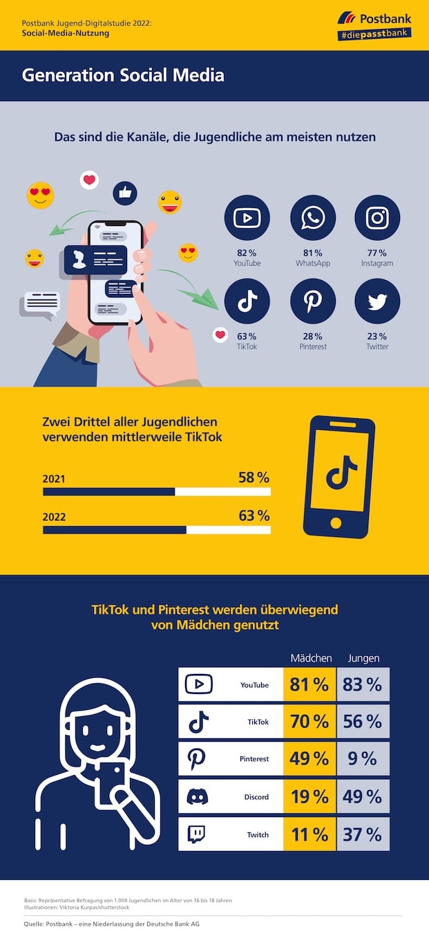 Denn: Facebook, einstiger Gigant der Social-Media-Branche hat bei Jugendlichen komplett den Anschluss verloren. Zu diesem Fazit kommt die „Postbank Jugend-Digitalstudie 2022“. Dafür ließ das Kreditinstitut 1.000 Jugendliche im Alter zwischen 16 und 18 Jahren repräsentativ befragen.
