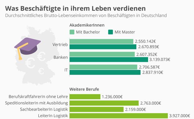 Ein Arbeitsleben dauert hierzulande knapp 37 Jahre, berichtet die Datenplattform Statista. Und wie viel verdienen die Leute währenddessen? Das wiederum wollte die Gehaltsdaten-Plattform Gehalt.de wissen. Wie hoch das Durchschnitts-Lebenseinkommen etwa bei Bankangestellten oder im Vertrieb ist – wobei hier nicht darauf eingegangen wird, um welchen Vertrieb es sich handelt –, zeigt die Infografik von Statista.