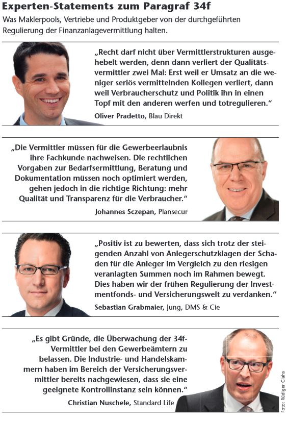 Viele davon dürften Versicherungsvermittler mit einer Zulassung nach Paragraf 34d sein, die bisher nach der alten schwachen Regulierung über den Paragraf 34c nur nebenher Fonds und andere Finanzanlagen vermittelt haben. Die Bereinigung ist ganz im Sinn der Regulierung, denn nur wer ausreichend qualifiziert ist und die weiteren Anforderungen, unter anderem Vermögensschaden-Haftpflicht, guten Leumund oder Zuverlässigkeit, erfüllt, erhält eine Erlaubnis.