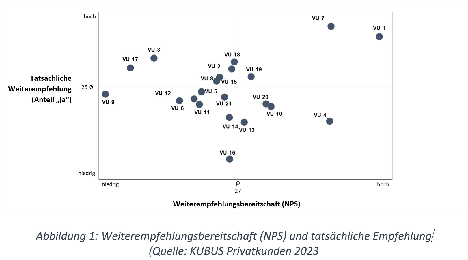 Im Sonderbericht „Empfehlungsmanagement“ sind diese spannenden Erkenntnisse zusammengefasst. Außerdem bietet der Sonderbericht Hinweise, wie ChatGPT im Empfehlungsmanagement eingesetzt werden kann. Es zeigen sich deutliche Unterschiede im Umwandlungserfolg von Empfehlungsbereitschaft in tatsächliche Empfehlungen zwischen den einzelnen Versicherern (siehe Abbildung 1). Dies ist ein klarer Hinweis, dass im Markt noch große Potenziale gehoben werden können. Einige Kernergebnisse der Studie sind im Folgenden dargestellt: