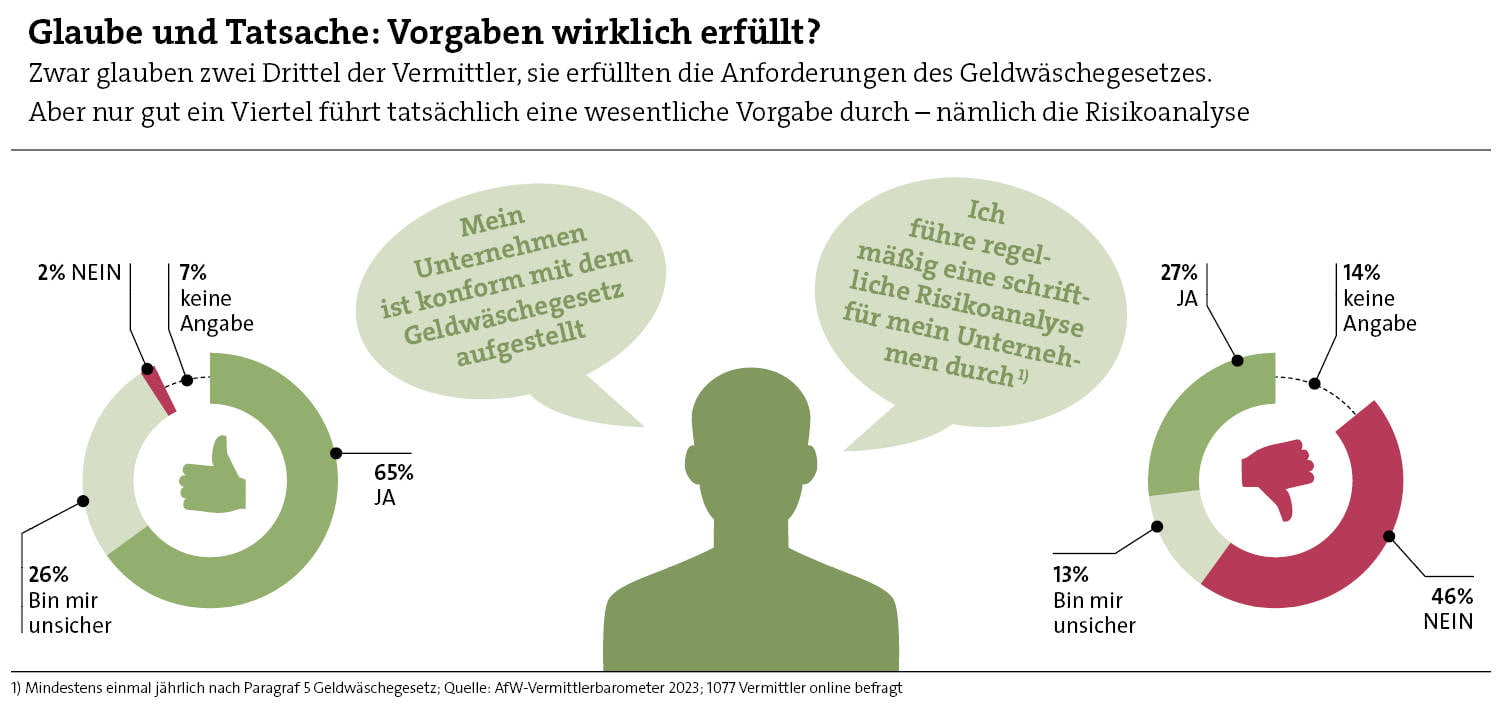 Die Vermittlerverbände setzen sich dafür ein, das Thema Geldwäsche ernst zu nehmen, denn viele Vermittler kennen ihre vollständigen GwG-Pflichten offenbar noch nicht. So sind sich laut aktuellem AfW-Vermittlerbarometer zwar zwei Drittel der befragten Vermittler (67 Prozent) sicher, dass ihr Unternehmen GwG-konform aufgestellt ist. Doch nur rund jeder Vierte (27 Prozent) führt tatsächlich eine regelmäßige, jährliche Risikoanalyse durch (siehe Grafiken links).