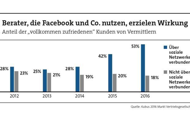 Auch für Vermittler hatte der Marktkenner spannende Einblicke mitgebracht: Berater, die sich beispielsweise über soziale Netzwerke mit ihren Kunden verbinden, verzeichnen seit 2013 deutlich wachsende Zustimmungsraten. Die Zufriedenheit mit Nicht-Social-Media-affinen Beratern ist hingegen stabil oder gar leicht rückläufig (siehe Grafik). Das zeigt die Kubus-Studie „Versicherung 2017 – aktuelle Marktentwicklungen in der Kundenzufriedenheit“, die Kullmann exklusiv vorstellte.