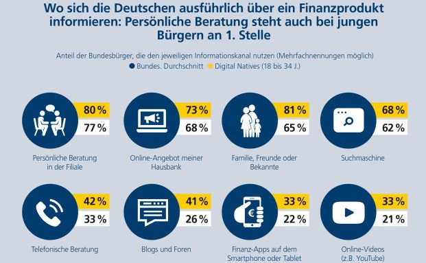Obwohl die Generation der 18- bis 34-Jährigen, die sogenannten Digital Natives, das Internet permanent nutzen, wollen sie beim Abschluss eines Festgeldkontos, der Baufinanzierung oder bei Wertpapieren persönlich beraten werden. Sie vertrauen ihrer Hausbank auch wesentlich mehr, als dem Bankwesen im Allgemeinen. Zu diesen Ergebnissen gelangt die Postbank Digitalstudie 2018.