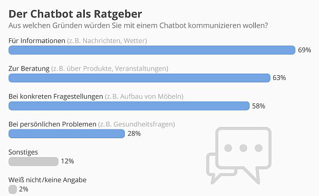 Wann wären Internetsurfer bereit, einen Chatbot zu nutzen? Diese Frage stellte der Marktforscher Yougov 205 Personen im Alter ab 18 Jahren. 69 Prozent der Befragten gaben an, sich über die künstlichen Gesprächspartner Infos beschaffen zu wollen. Und 63 Prozent wollen ihn nutzen, um sich über Produkte oder Veranstaltungen beraten zu lassen.