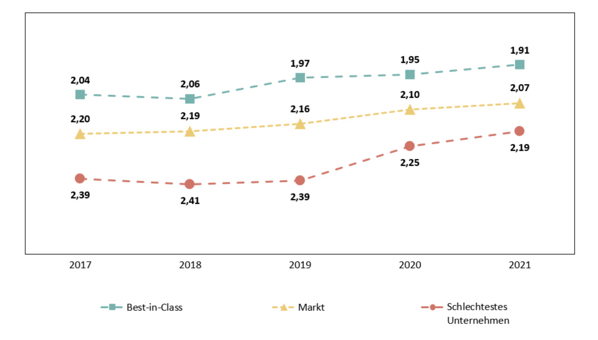 Das Branchenniveau in der Kundenzufriedenheit liegt heute laut Studie auf dem Niveau der besten Unternehmen im Jahr 2018, die aktuell schwächsten Gesellschaften rangieren auf dem Marktniveau von vor drei Jahren.